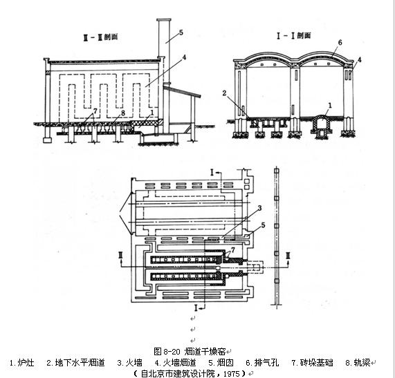 煙道加熱干燥窯是一種簡(jiǎn)易干燥設(shè)備,為小型企業(yè)所采用。它的結(jié)構(gòu)型式較多,圖8-20所示為比較完備的一種。干燥窯長(zhǎng)8.5m、寬3.6m、高4.5m。在干燥窯一端地下設(shè)有小型爐灶1,爐灶后端有四個(gè)開(kāi)口,分別接連四條地下水平煙道2,每條煙道在靠近門(mén)端附近匯合,并通連一側(cè)的火墻3(側(cè)墻),火墻內(nèi)的煙道4呈垂直走向,至末端與煙囪5底部相連。由爐灶燃燒生成的熾熱煙氣,分別流過(guò)水平煙道,經(jīng)過(guò)兩側(cè)火墻,最后流入煙囪排出。窯內(nèi)的空氣由水平煙道及火墻加熱,對(duì)流傳熱,加熱和干燥木料。
